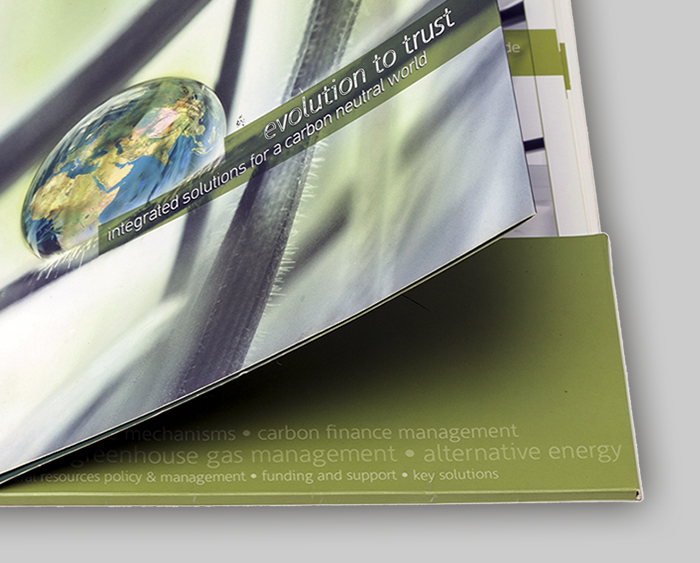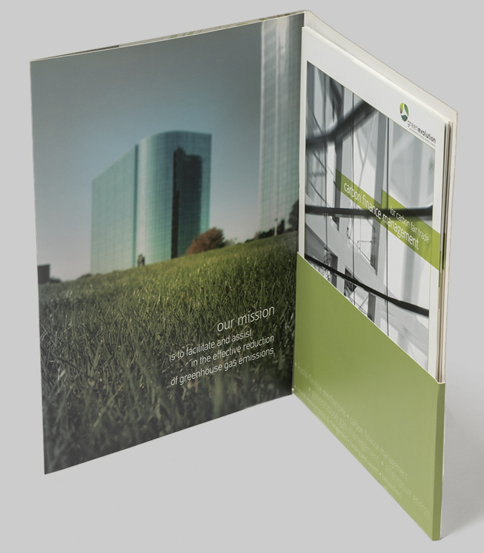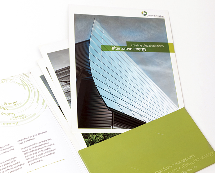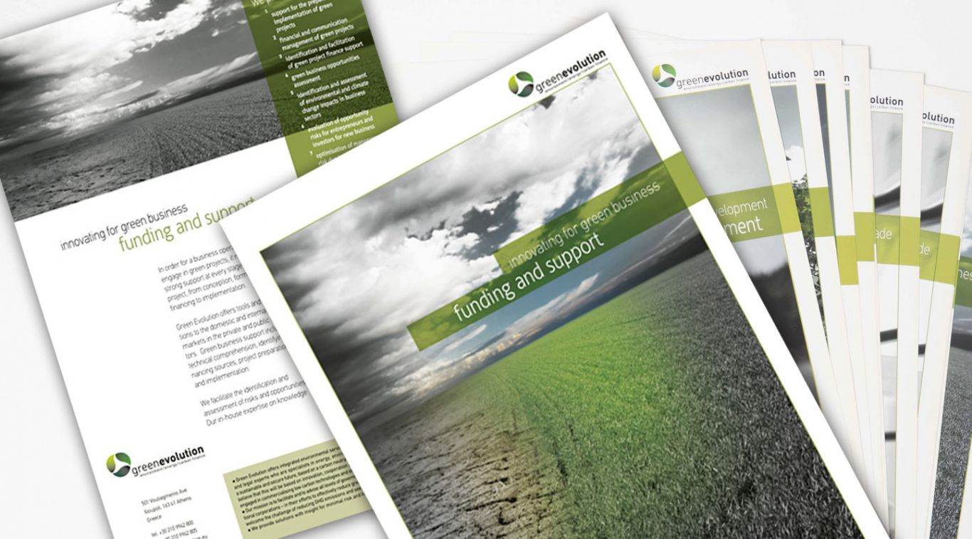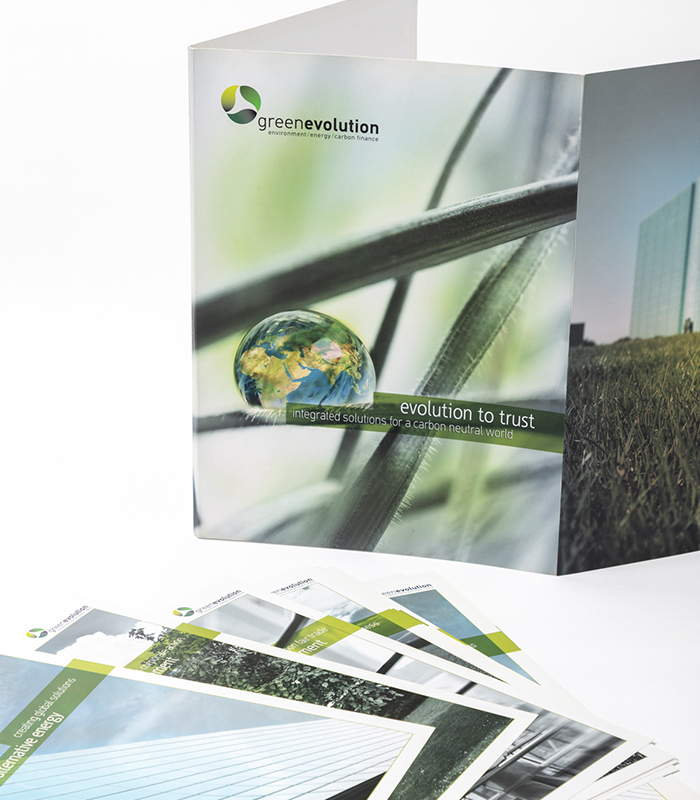 Σχεδιασμός και print production για Corporate brochure της Green Evolution. Εταιρεία που δραστηριοποιείται στους τομείς του περιβάλλοντος, ενέργειας και οικονομίας του άνθρακα. Για να δοθεί έμφαση και ανάλυση στις υπηρεσίες σχεδιάστηκαν μονόφυλλα (2 όψεων) για κάθε υπηρεσία και coprporate folder τρίπτυχο.